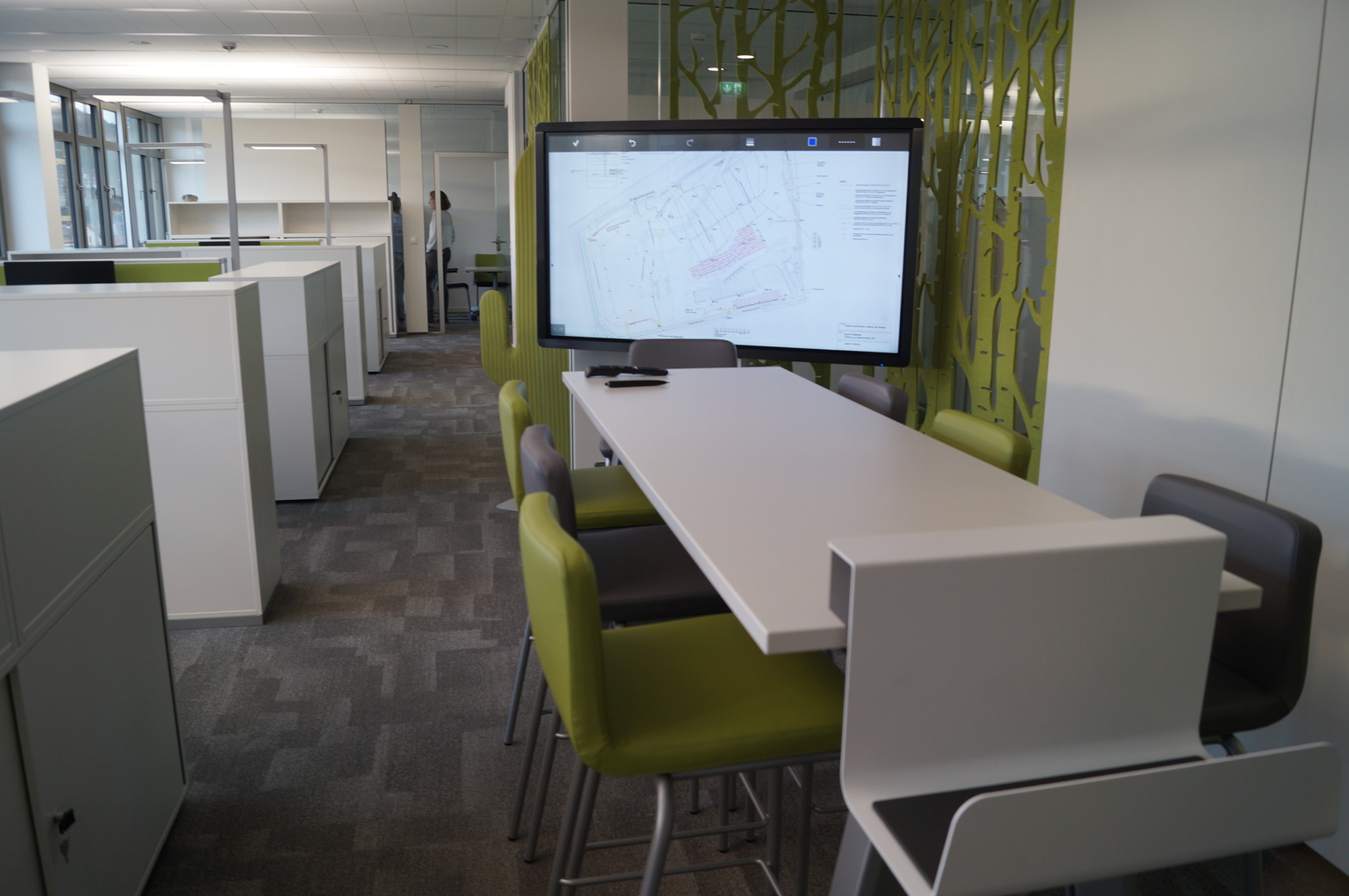 Einzelbüros gibt es nur wenige, in den Mehrpersonenbüros wurde wert gelegt auf eine gute Akustik: Verschiedene Schall-Absorber sorgen für geringen Lärm. Als farbliche Akzente dominieren Grüntöne – die Farbe des Landkreises und des AWB.