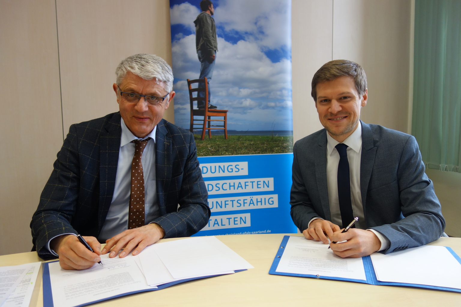 Setzen ihre Unterschriften unter eine gemeinsame Zielvereinbarung: Oberbürgermeister Dr. Bernhard Matheis (links) und Hanno Weigel, stellvertretender Leiter der Transferagentur.