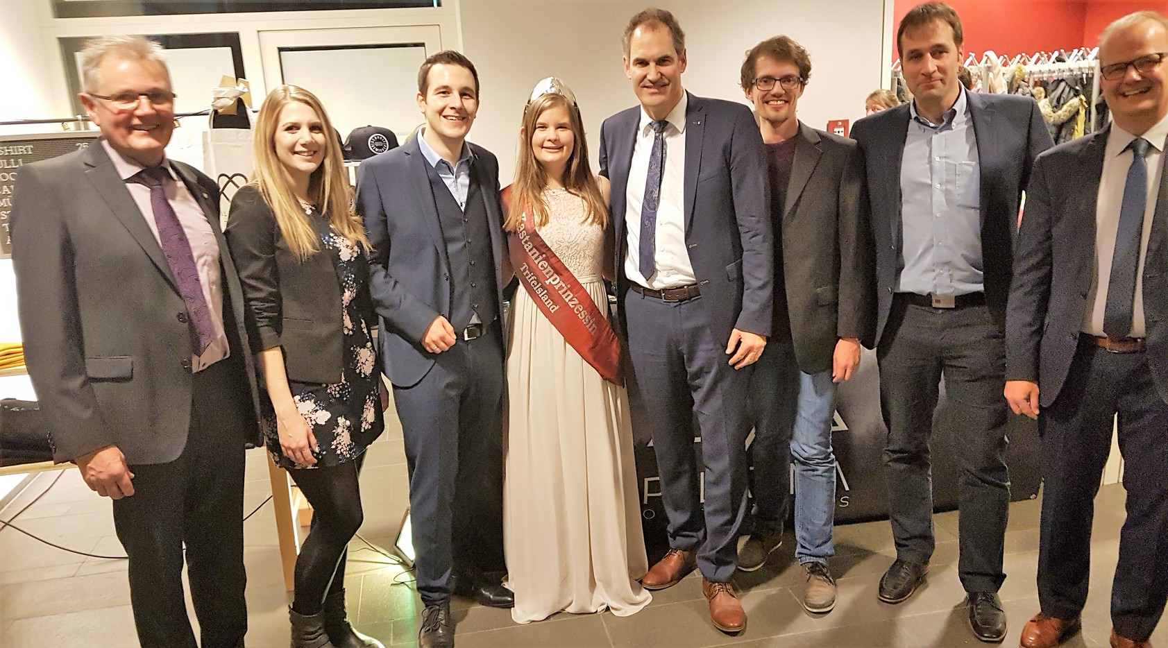Gute Stimmung beim Neujahrsempfang des Landkreises: (v.l.) Thomas Kiefer, Lena Hirschinger, Christian Burkardt, Kastanienprinzessin Natalie I., Dietmar Seefeldt, Benjamin Burckschat, Michael Martin, Marcus Ehrgott.