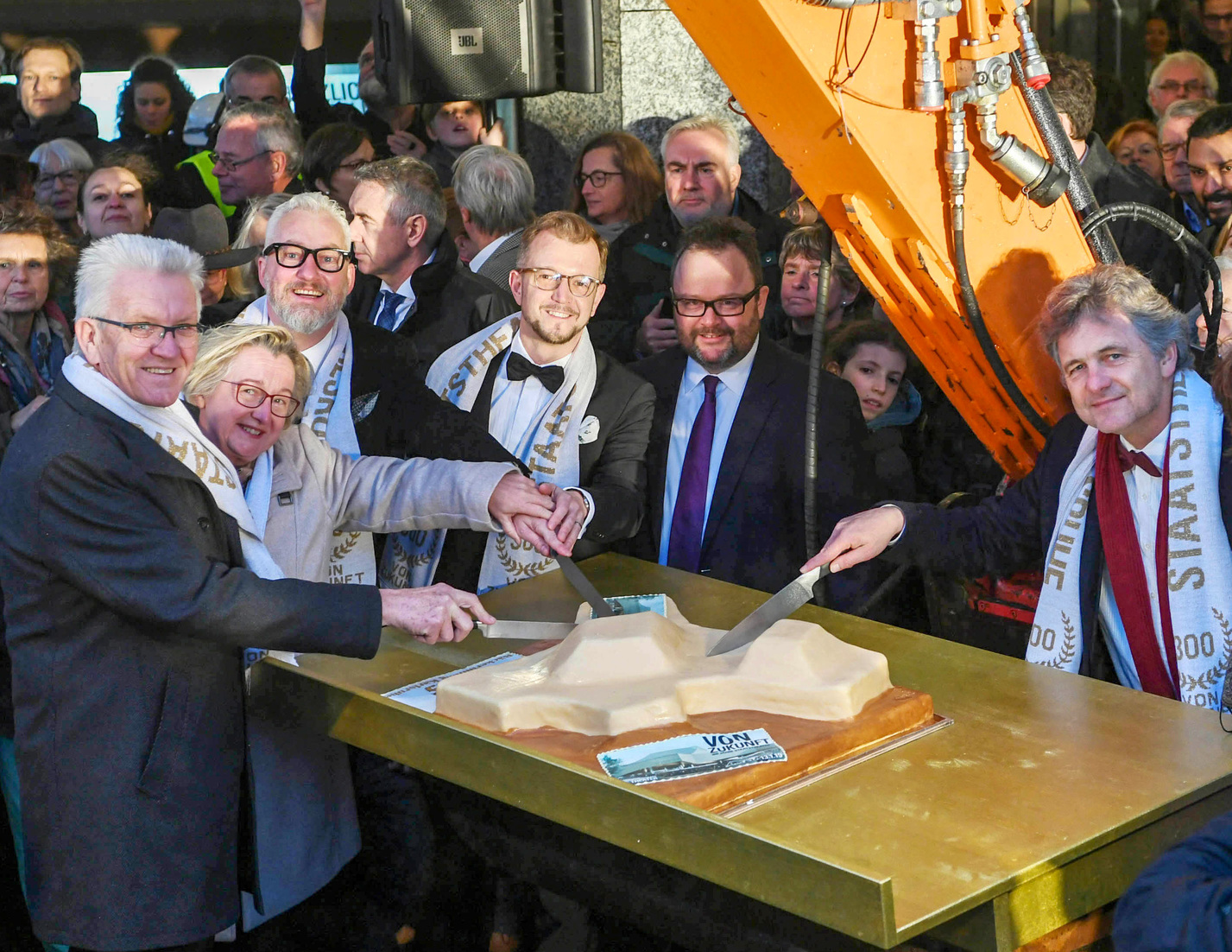 In die nächsten 300 Jahre blickend eröffneten Ministerpräsident Winfried Kretschmann und Generalintendant Peter Spuhler das Fest unter dem Motto Wir bauen Zukunft mit dem Anschnitt der Geburtstagstorte – dem Anlass entsprechend auf einer Baggerschaufel präsentiert.