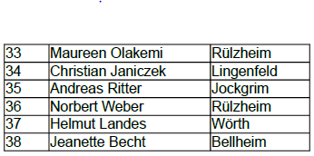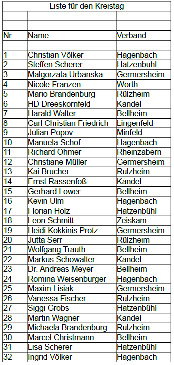 Die Mitglieder votierten für eine starke Spitze der Kreistagsliste und benannten die ersten 6 Plätze dreifach. Christian Völker (Hagenbach) führt die Liste an, gefolgt von Steffen Scherer (Hatzenbühl), Malgorzata Urbanska (Germersheim), Nicole Franzen (Wörth) und Hans-Detlef-Dresskornfeld (Kandel).