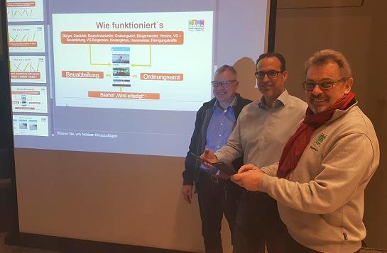 Stadtbürgermeister Franz Xaver Scherrer, 1. Stadtbeigeordneter Chrisitian Hutter und Bauhofleiter Rolf Oberfrank (v.re.) bei der Freigabe der Hagenbacher Bürger-App.