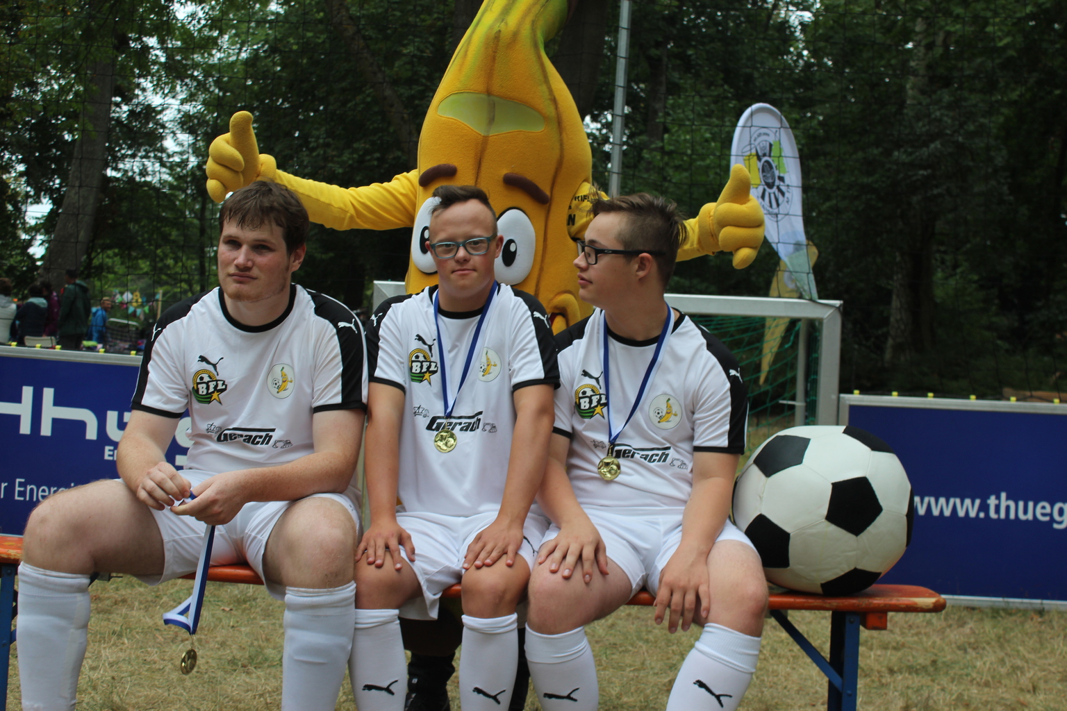Auch mit von der Partie: das Maskottchen der Bananenflankenliga und die jungen Sportler aus der Südpfalz.