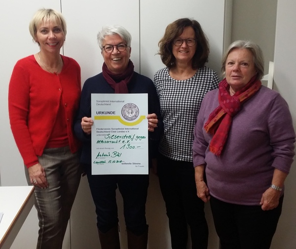 Die Präsidentin des Soroptimist International Club Landau Antonia Böhl, Pascale Schneider und Sabine Theis freuten sich der Vorsitzenden Christine Baumann den Betrag zu überreichen, der sich unter anderem aus den Einnahmen der Veranstaltung zu 100 Jahre Frauenwahlrecht im Kreishaus und zahlreiche Spenden aus dem Club selbst zusammensetzt.