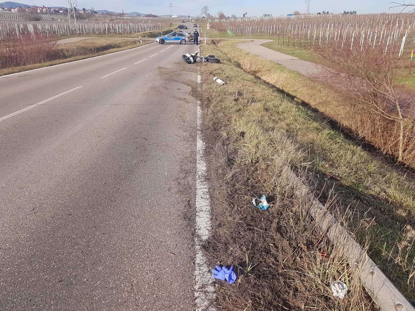 Vor Ort wurde der noch am Unfallort verstorbene 43-jährige Fahrer des Motorrads gefunden. Auf Anordnung der Staatsanwaltschaft Landau wurde ein Gutachter eingeschaltet und das Fahrzeug und der Leichnam sichergestellt.