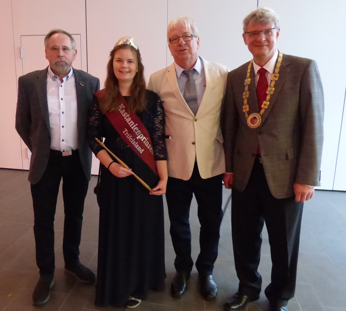 Thomas Wollenweber, Dr. Schulz, Kastanienprinzessin Natalie und Reiner Niederberger begrüßten die Gäste des Neujahrsempfangs. (v.r.).