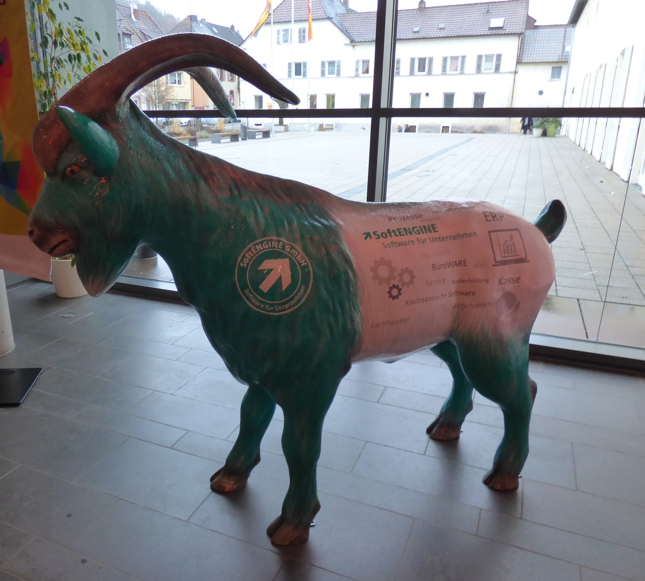 Geißbock im Foyer: Die Firma Softengine hat ihn erworben. Er wird ein Jahr für die Firma in Annweiler werben und geht dann in das Eigentum des Spenders über.