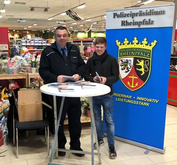 Wegen dem Auftreten dieser Vorfälle informierte heute (11. Februar) in der Zeit zwischen 10 Uhr und 12 Uhr Polizeioberkommissar Stefan Kraus sowie Polizeikommissarsanwärter Niklas Menkel von der Polizei Edenkoben mit einem Informationsstand im Wasgaumarkt vor allem älteren Kunden über diese Angelegenheit.
