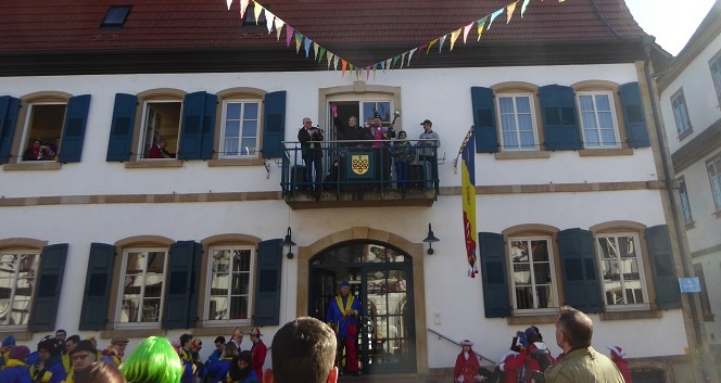 Derweil herrscht im Rathaus „Ausnahmezustand“, der mit dem Eintreffen der Karnevalskutsche seinen Siedepunkt erreicht. Aufgepeitscht durch schmissige Marschmusik stürmt das närrische Volk das Gemeindehaus, wo sich der Ortsbürgermeister vergeblich verstecken wird. Pfiffige Gardistinnen haben ein Gespür für Bürgermeisterverstecke und werden ihn im Ratssaal vorführen.
