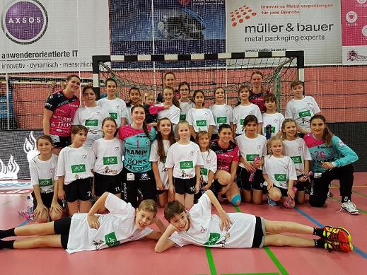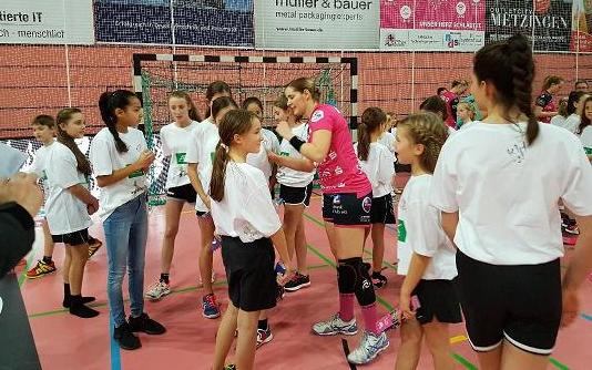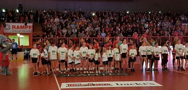 Wörth – 18 Handball-Mädchen und drei Jungens der E- und D-Jugend des TV Wörth sind beim Lokalderby der Frauen-Bundesliga TUS Metzingen gegen TV Nellingen in der Paul-Horn-Arena in Tübingen am Abend des 2.Weihnachtsfeiertages mit den „Tussies“ aufgelaufen.