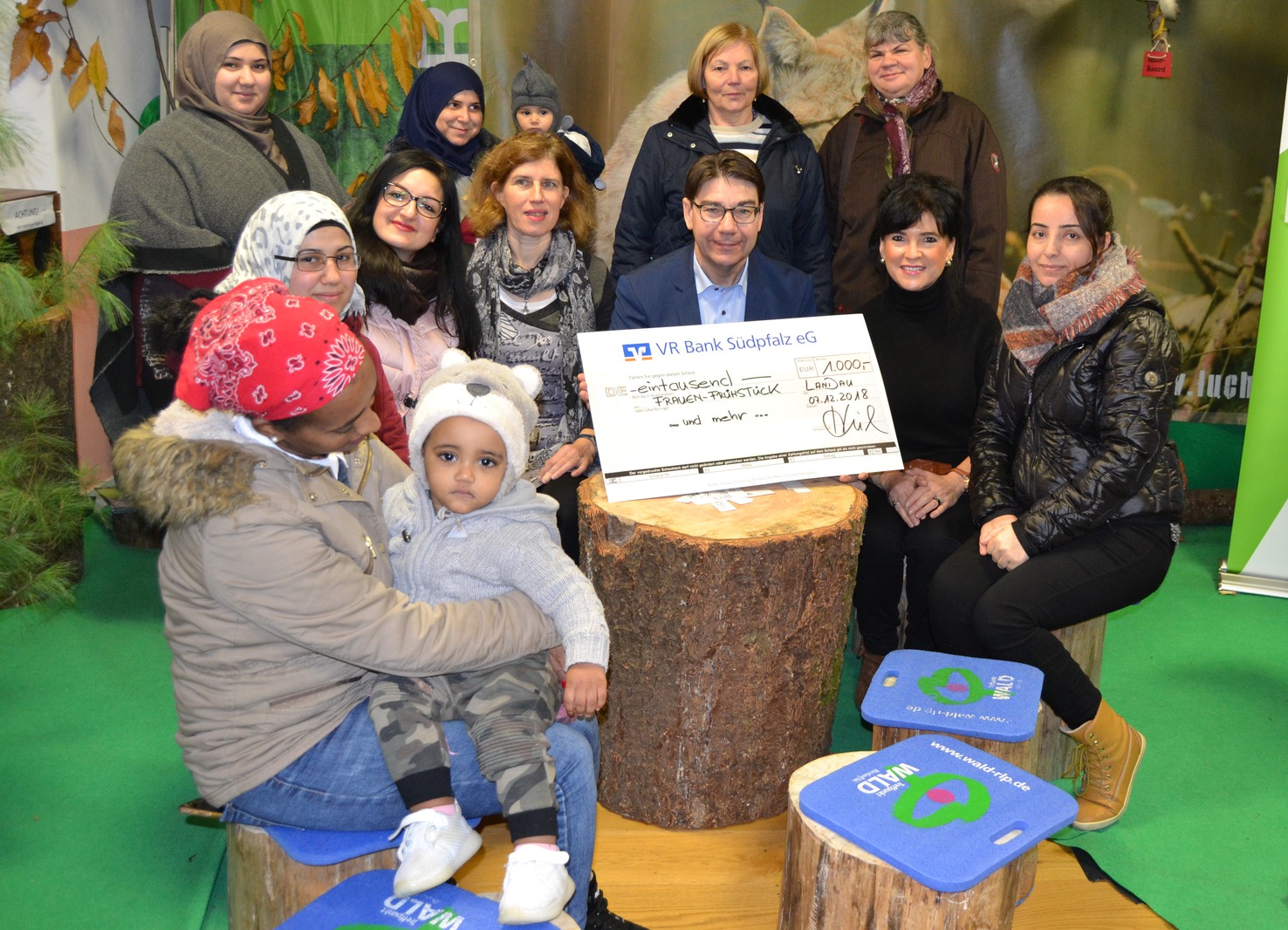 Die Spendenübergabe fand im Rahmen einer Führung durch die Mitmachausstellung „Haus der Sinne“ im Haus der Jugend statt, an der neben Oberbürgermeister Thomas Hirsch, Sabine Heil, Regionaldirektorin bei der VR Bank Südpfalz, und Christine Maas auch Besucherinnen des Frauenfrühstücks im Haus der Familie teilnahmen.