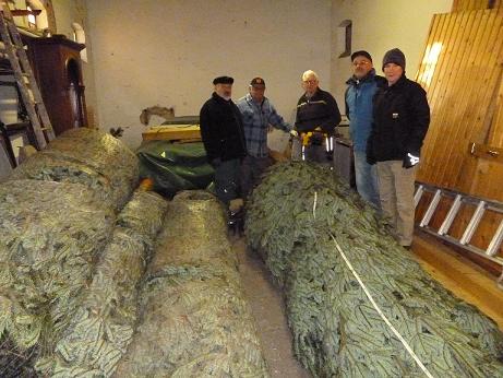 Zuvor mussten die stolzen Tannenbäume auf gleiche Länge zugeschnitten und aufgestellt werden, bevor Lichterketten, Weihnachtskugeln und Strohsterne aufgebracht wurden.