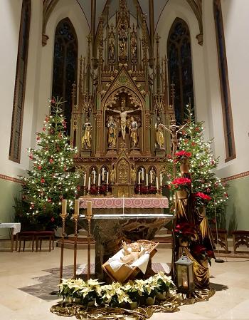 Pfarrer Thomas Buchert hat selbst mit Hand angelegt. So steht unter anderem vor dem Zelebrationsaltar eine Wiege mit dem Christuskind. Davor sind sieben weiße „Weihnachtsterne“ aufgestellt, die gleichsam für die sieben Sakramente stehen. Hinter der Wiege steht das Kreuz, vor dem auf einer Staffelung fünf rote „Weihnachtssterne“ zu sehen sind, die für die fünf heiligen Wunden des gekreuzigten Heilandes stehen.